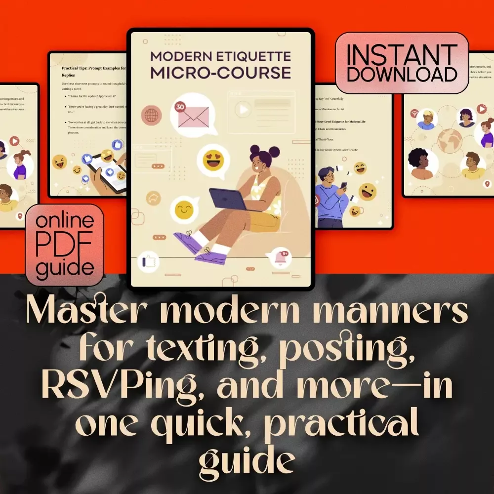 Good manners never go out of style—but in today’s fast-paced digital world, knowing what’s polite can be confusing. The Modern Etiquette Micro-Course is a simple, straightforward guide that helps you navigate texting, social media, and everyday communication with confidence and class. Whether you’re responding to a group chat, declining an invite, or wondering what not to post, this micro-course has practical, real-life answers you can use right away.