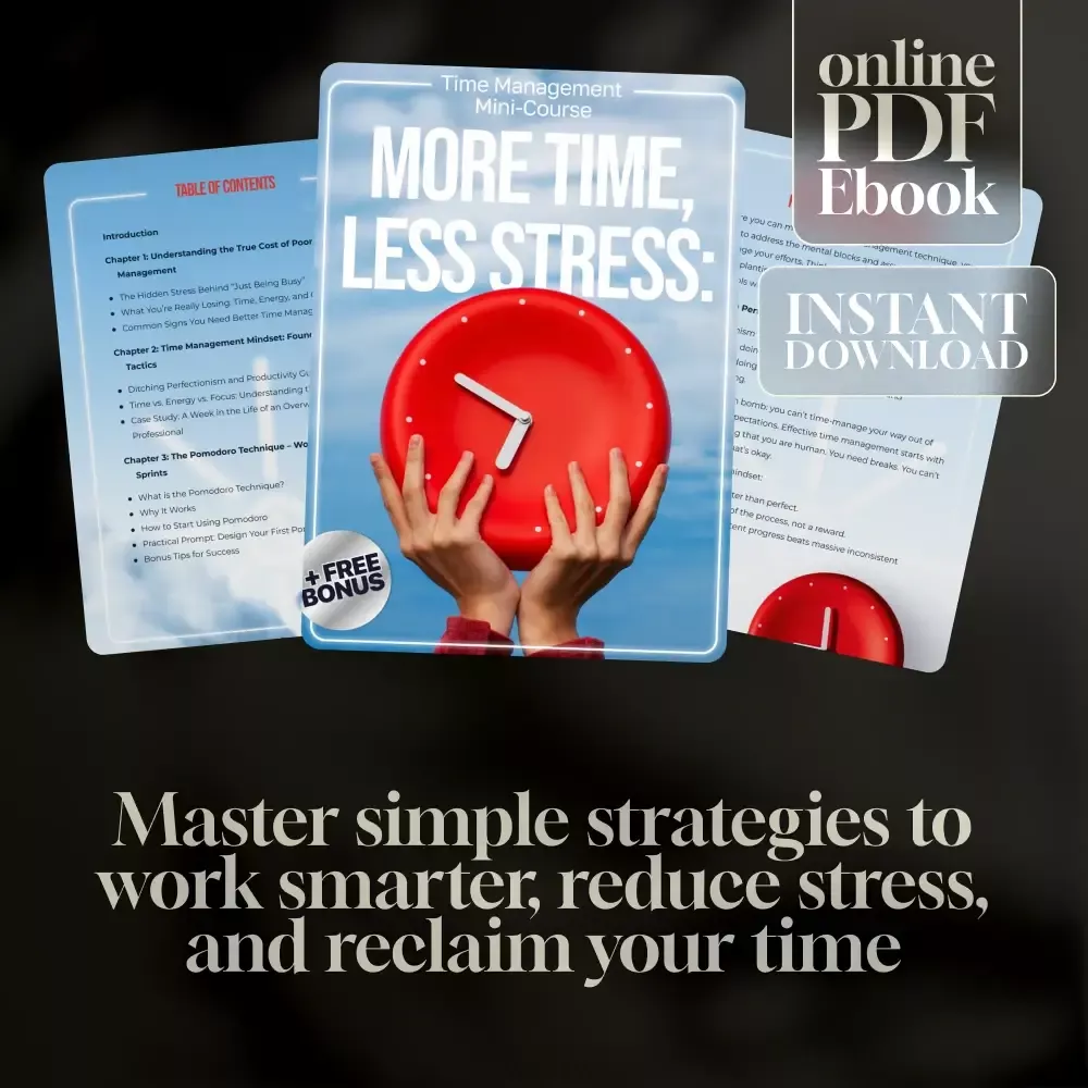 Unlike generic productivity books, the More Time, Less Stress: Time Management Mini-Course gives you step-by-step guidance, real-life case studies, and quick prompts you can use immediately. It’s built for busy people who need practical solutions—not theory—so you can start applying changes the same day you download it.