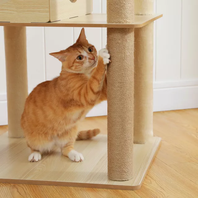 Unlike ordinary cat trees, this tower blends functional design with elevated style. Its high-quality wood finish offers unmatched durability, while the attention to comfort—soft perches, cozy hideout, and playful toys—creates a cat-approved haven. It’s more than just a tree—it’s your pet’s favorite place in the house.