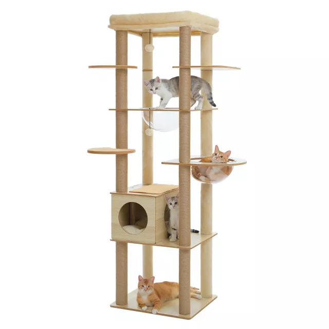 Transform your home into a feline paradise with this elegant, multi-level cat tree designed for both fun and comfort. Whether your kitty loves to climb, scratch, snooze, or simply survey their kingdom from above, this wooden cat tower delivers it all. With multiple tiers, a plush top perch, cozy condo, and interactive toys, your cat will never be bored again. Crafted in a stylish beige finish to blend seamlessly into your decor, it’s more than just a pet accessory—it’s a lifestyle upgrade for your furry friend.