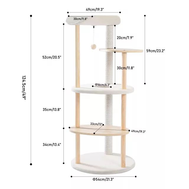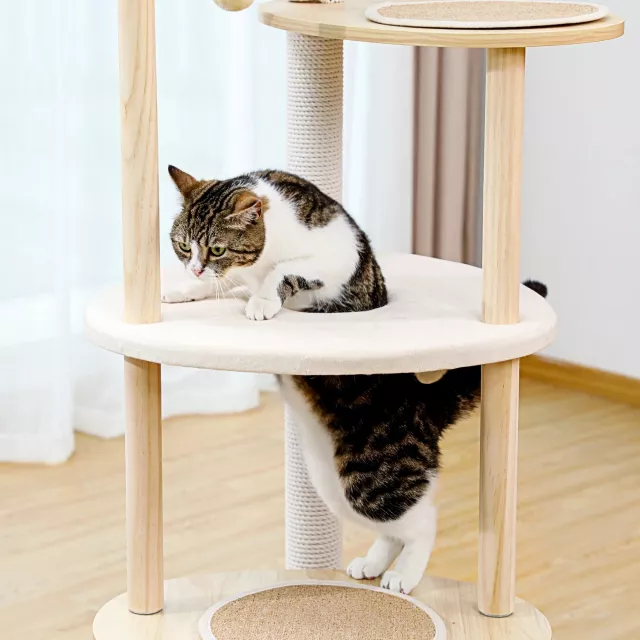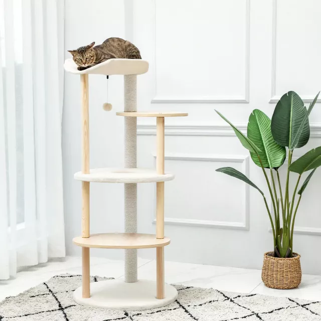 The soft beige tones blend effortlessly into any room, while the sturdy wood construction ensures long-lasting use. At just under 30 lbs, it’s easy to move around yet strong enough to support all your cat’s energetic antics. This cat tree is especially great during the warmer months, providing an airy, cool structure where your cat can relax without overheating.