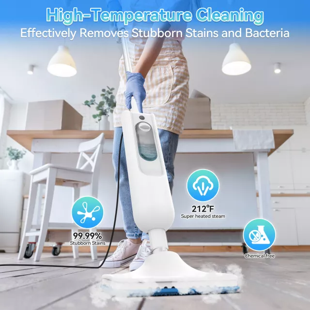 Discover a smarter, faster, and safer way to clean your home with this powerful high-temperature steam mop. Designed to tackle dirt, grime, and bacteria without using harsh chemicals, it provides a natural clean you can trust. With a large 12.2 oz integrated water tank and two steam settings, it delivers up to 15 minutes of continuous steam, perfect for freshening up every room in your house. The detachable handheld cleaner lets you go beyond the floor and clean tiles, countertops, upholstery, and more with ease.