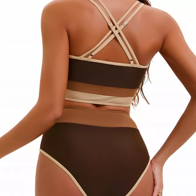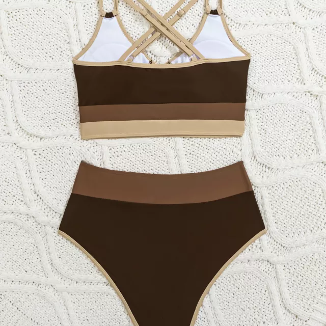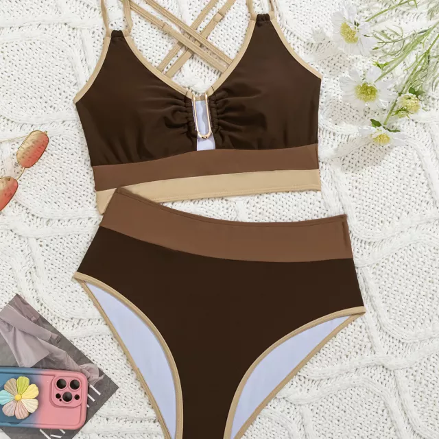 This swimsuit is more than just swimwear—it’s a style statement. Its coffee-hued patchwork design is sophisticated and sultry, offering a unique twist on classic beachwear. The U-neckline with metal detailing adds luxury to the look, while the high waist keeps it modern and flattering. Whether you’re soaking up the sun on the sand or diving into fun, this bikini is built for comfort, confidence, and style.