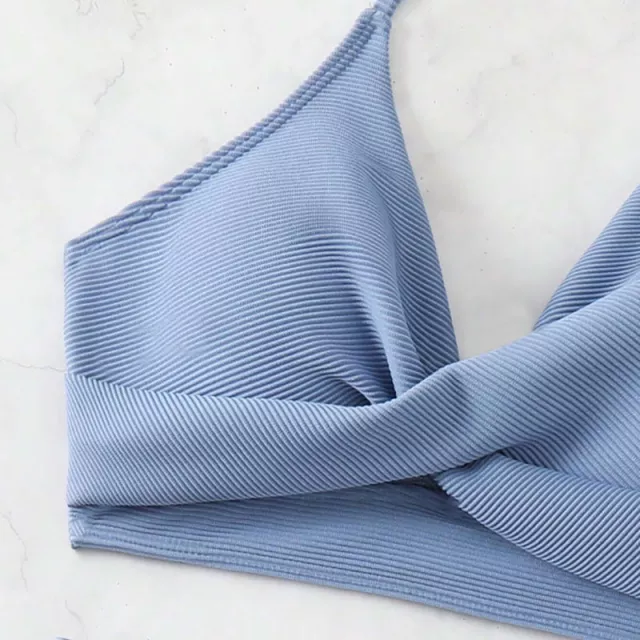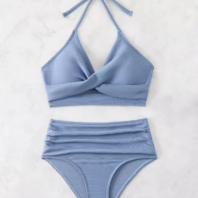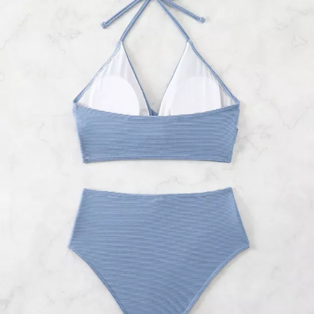 Made from high-quality polyester and terylene blend, this knit bikini hugs your curves while offering wire-free support and a secure fit. The halter-style top features a subtle push-up design with soft padding for added lift and shape, while the backless style and cross-tie details highlight your silhouette with flirty appeal. The high-waist bottoms flatter your midsection and elongate your legs, making this bikini a must-have for every beach-loving woman.