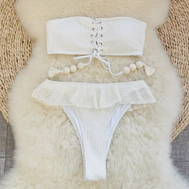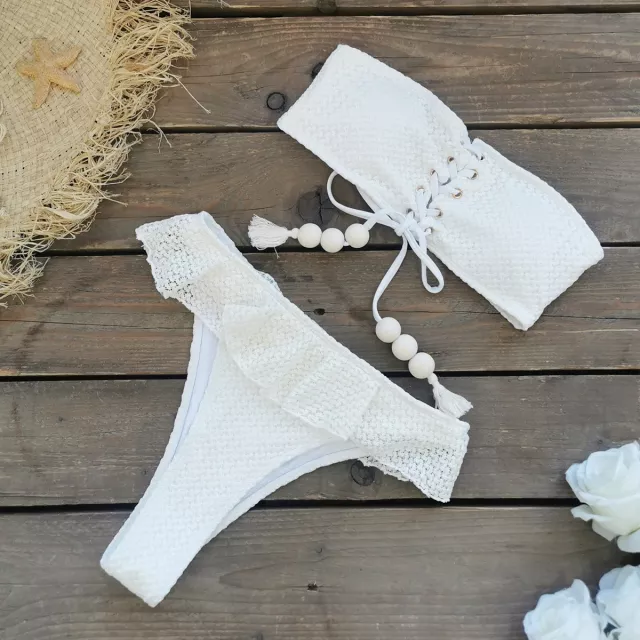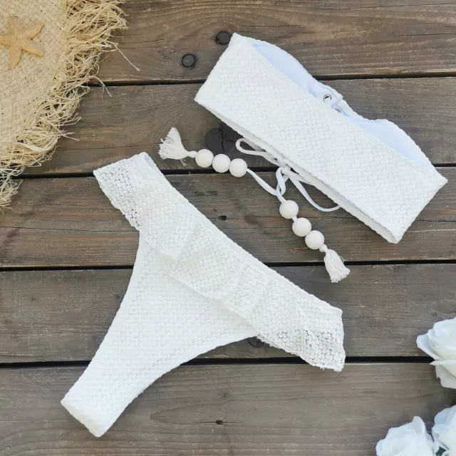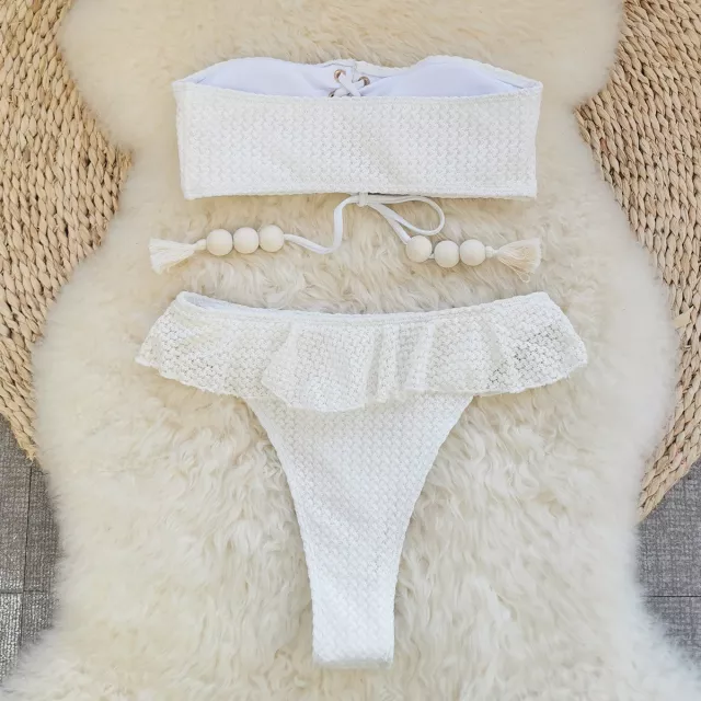 Make waves this summer with the ultimate beach-ready look. This sexy white bandeau bikini set is designed to highlight your curves and exude confidence, whether you’re lounging by the pool, strolling along the beach, or turning heads at a tropical resort. With its elegant ruffles, cross bandage push-up top, and high-waisted bottoms, this two-piece swimsuit blends timeless style with bold, modern flair. The bandeau-style crop top enhances your bust with a flattering push-up effect, while the high-waist bottoms sculpt your waist for a sleek, hourglass silhouette.
