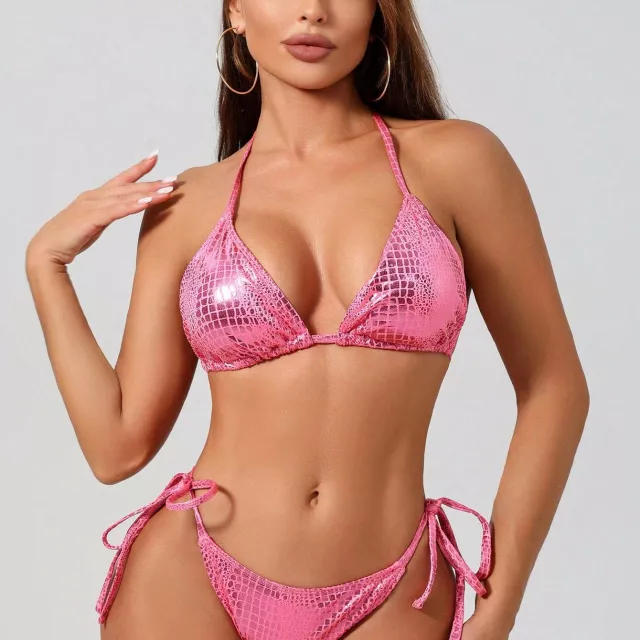 Make waves this season with our stunning Shiny Glossy Triangle Bikini Set – a two-piece swimsuit designed for women who love to shine. This sexy, head-turning set features a sleek, glossy finish in solid colors that catch the light perfectly under the sun, whether you’re on a tropical beach, lounging by the pool, or posing for vacation pics. Designed with a halter neck and open back, this bikini adds a sultry twist to a timeless beachwear style. The triangle top offers adjustable ties for a perfect fit, while the high-waisted bottom enhances your curves and provides just the right amount of coverage.