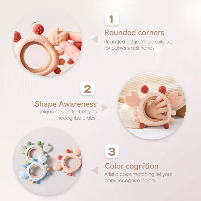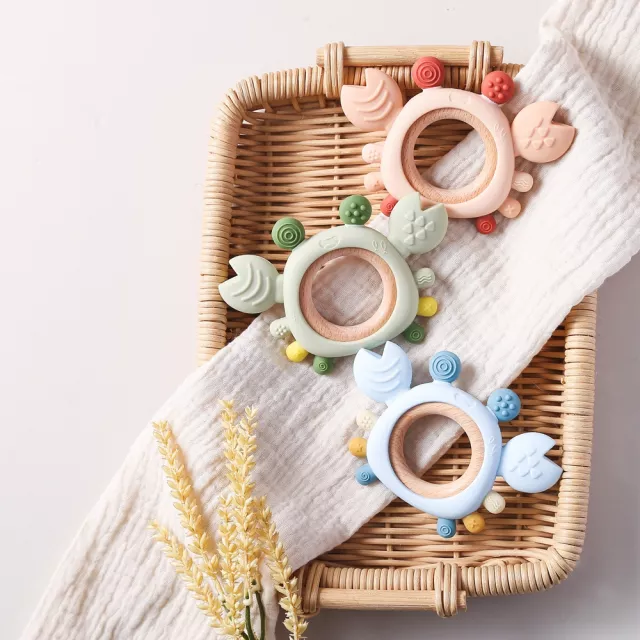 Whether your baby is 3 months old or nearing toddlerhood, this teether is perfect for every stage of early development. Its playful crab shape is easy to grasp with tiny hands, helping to build motor skills while calming irritated gums. The combination of soft silicone and a firm wooden ring provides a variety of textures to explore, stimulating sensory development in a fun and soothing way.