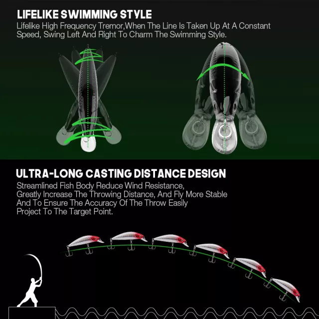 This crankbait is made from strong ABS plastic, ensuring durability and long-lasting use. Its sinking design and small diving lip allow it to reach depths of up to 5 ft while maintaining a natural swimming motion. Equipped with two sharp carbon steel treble hooks, it ensures a solid hook-up and prevents fish from escaping. The silent design and bright reflective finish grab the attention of predators from all angles, even in low-light waters.