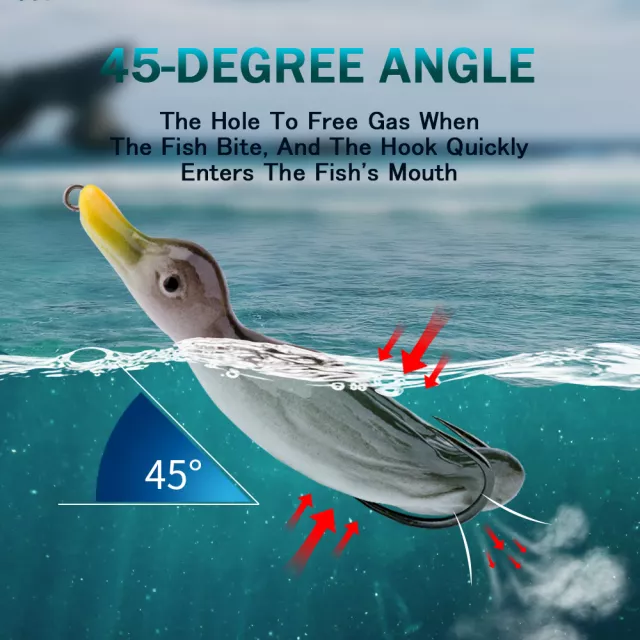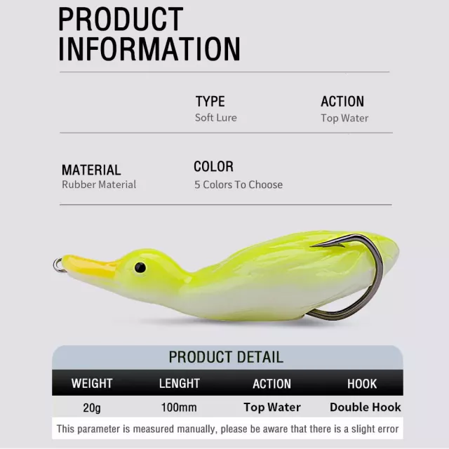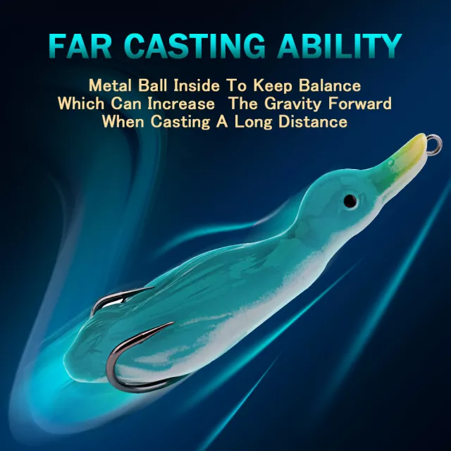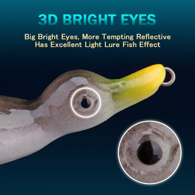 Catch more trophy fish with this lifelike soft shad duck bait designed to trigger aggressive strikes. With a length of 4 inches and a weight of 0.7 oz, this silicone fishing lure mimics the natural movement of prey on the water’s surface. Its soft rubber body and 3D bright eyes create an irresistible presentation that draws in predatory fish like pike, snakehead, and catfish.