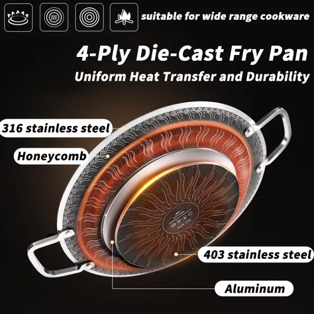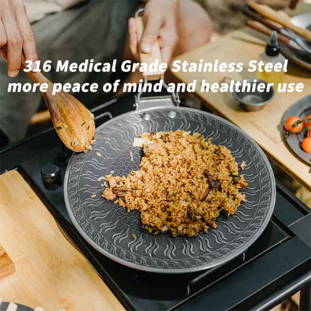 Bring the joy of delicious meals to your outdoor adventures with this premium stainless steel camping frying pan. Designed for campers, hikers, and outdoor enthusiasts, this wok-style skillet delivers exceptional cooking performance on any stove. With its durable 316 stainless steel construction and innovative double-sided honeycomb surface, it ensures even heat distribution and effortless cooking every time. Whether you’re searing meats, stir-frying vegetables, or making a hearty breakfast, this pan is built to handle it all.