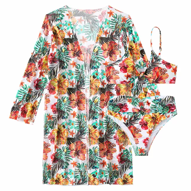 Unlike typical swimwear, this three-piece design brings together fashion and versatility. The long-sleeved mesh blouse sets it apart, letting you easily transition from poolside to beach bar. Plus, its bold floral pattern and high-waisted cut are universally flattering, making it a standout choice for women of all shapes and sizes.