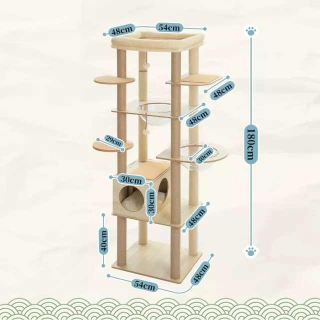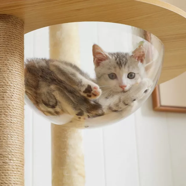 With a spacious built-in condo, a stylish acrylic hammock, and a plush top bed, every cat can claim their favorite spot. The tree also includes fun hanging pompoms to spark playful energy and keep your cats entertained and mentally stimulated. Crafted from sturdy wood, this cat tower supports daily jumps, climbs, and lounging without wobbling—perfect for even the busiest of multi-cat homes.