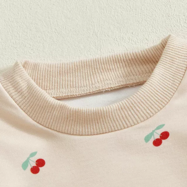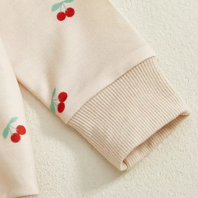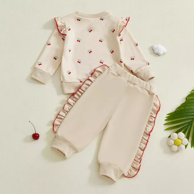 The sweatshirt features delicate ruffle details on the shoulders and a fun cherry print that brings a cheerful pop of color to dreary days. The pants are soft, stretchy, and comfy — perfect for crawling, exploring, or snuggling. With a gentle pullover design and elastic waistband, dressing and changing are quick and fuss-free.
