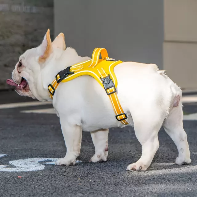 Crafted from high-quality polyester blends, this harness is soft on your dog’s fur but tough enough to handle daily use. The quick-release buckle makes it effortless to put on and take off, while the explosion-proof design keeps even the most excitable dogs secure. Its reflective trim boosts visibility in low light, giving you peace of mind during evening or early morning strolls. Available in vibrant colors like orange, pink, grey, black, and yellow, it’s a stylish upgrade for your dog’s walking gear.
