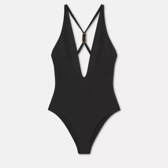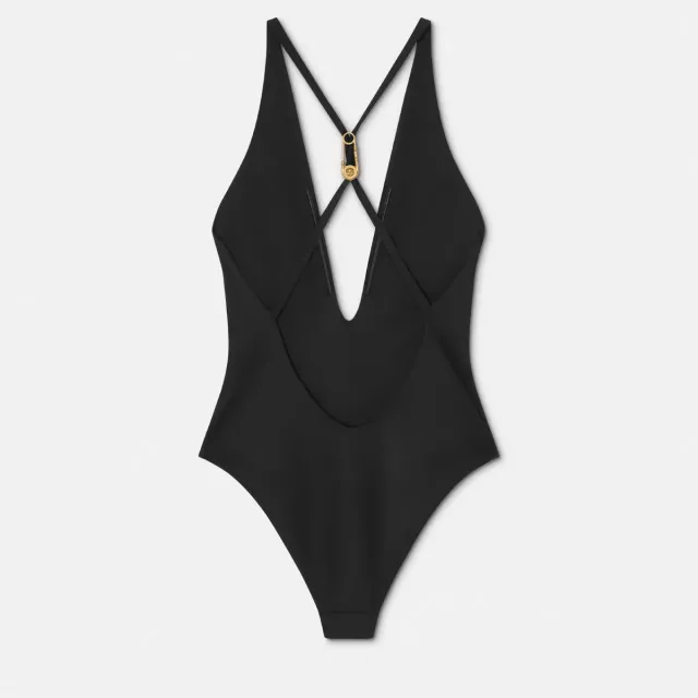 Whether you’re lounging poolside at a five-star resort or strolling the shoreline of a Mediterranean escape, this swimsuit delivers unmatched sophistication. The deep V-neck gracefully enhances your neckline, while the crisscross straps at the back offer both support and a touch of drama. And let’s not forget the legendary Medusa pin — a signature Versace detail that sets this suit apart from anything else on the beach.