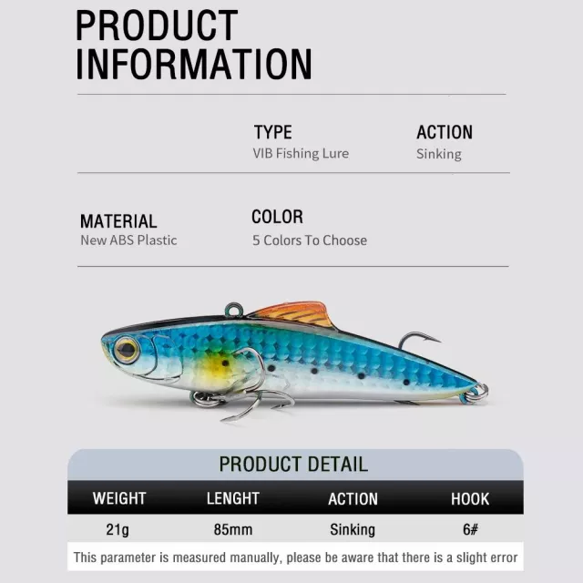 Designed for serious anglers who won’t let cold weather stop the chase, this high-performance VIB sinking lure brings together cutting-edge design, durability, and irresistible action to outsmart predator fish in any season—especially winter. With a compact 3.3-inch (85mm) profile and a weight of 0.74oz (21g), this hard bait is made for long casts, deep dives, and tight, vibrating motion that mimics a real wounded baitfish. Whether you’re working frozen lakes, sea shores, or quiet rivers, this lure performs where others fail.