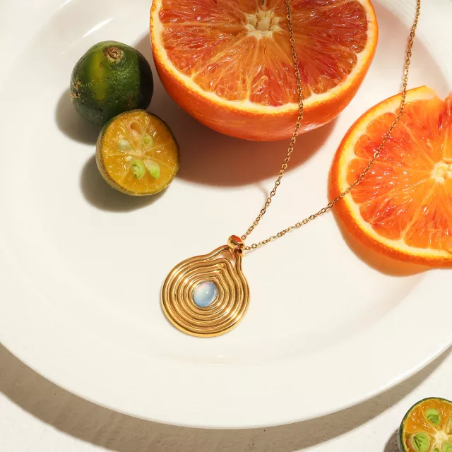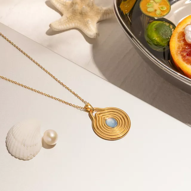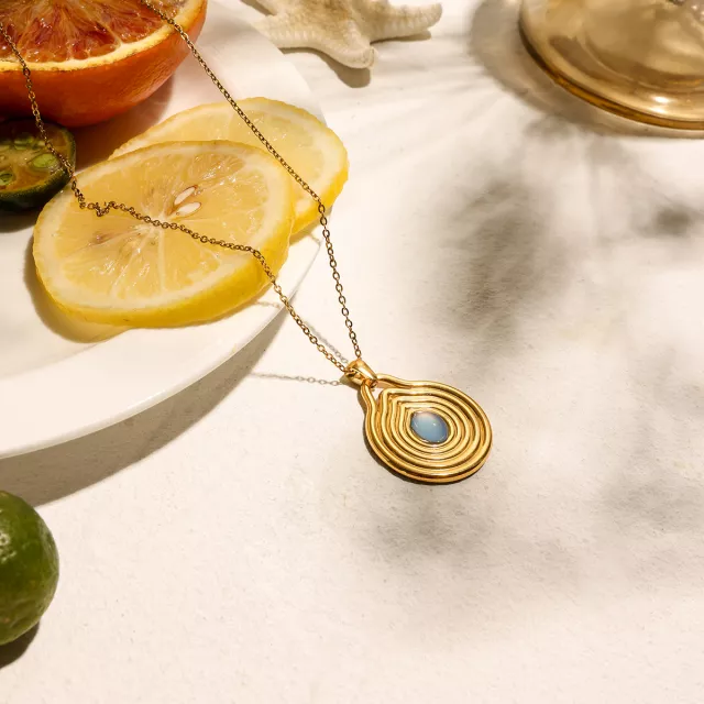 Elevate your style with this stunning Vintage Ribbed Pendant Necklace, a piece that blends old-world elegance with contemporary craftsmanship. This beautifully crafted necklace features a round geometric pendant inlaid with rich blue resin, suspended from an 18K gold-plated stainless steel chain. With its bold yet delicate design, it’s the perfect statement piece to accompany your favorite vacation outfit or a night out with friends.
