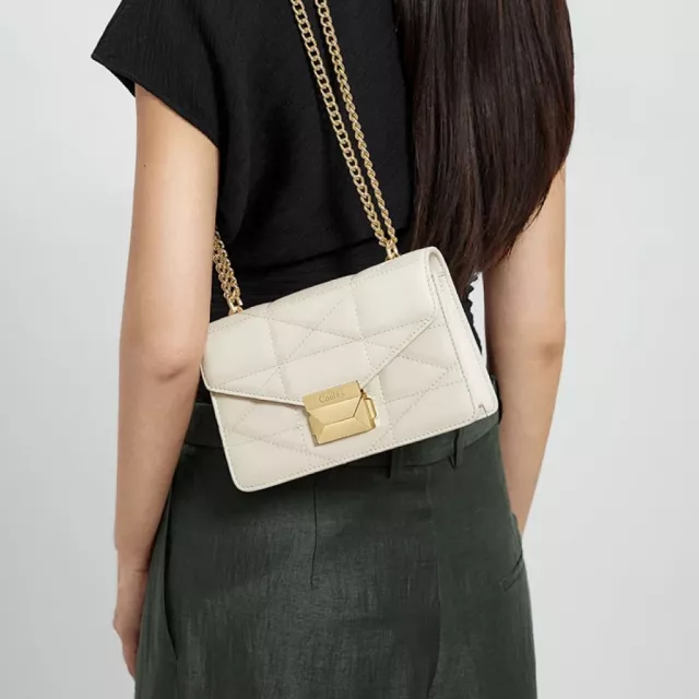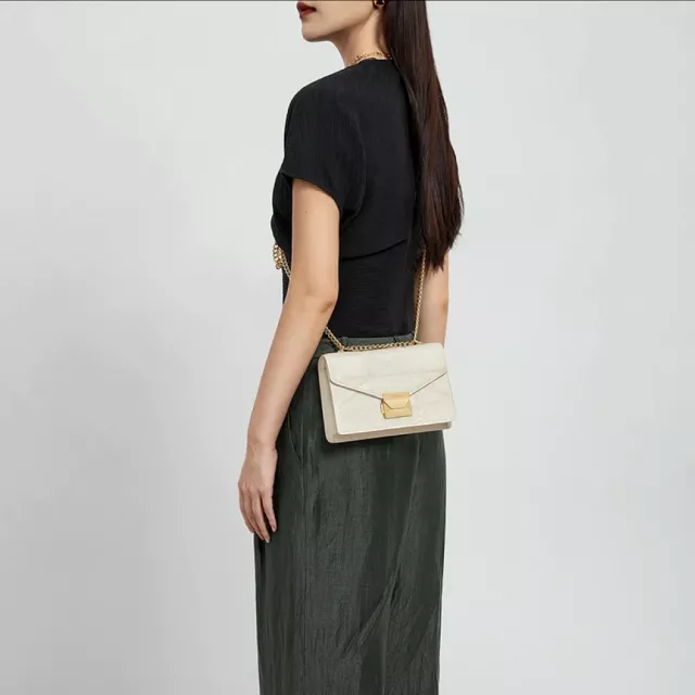 If you’re looking for a handbag that combines modern style with everyday usability, this is it. The white leather finish pairs beautifully with almost any color palette, and the metal crossbody strap brings a fresh twist to a classic accessory. Compact yet eye-catching, it holds just what you need while turning heads everywhere you go.