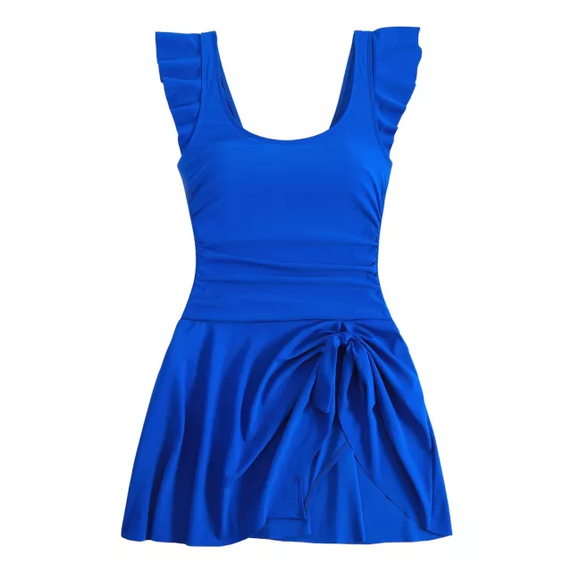 Turn heads this summer with our elegant Women’s Ruffle Sleeve One-Piece Swimdress. Designed to flatter every curve, this swimsuit blends timeless style with modern comfort. With its graceful ruffle sleeves, playful tie knot front, and flowing swim skirt, you’ll feel confident, comfortable, and beautiful whether you’re lounging poolside or diving into the waves.
