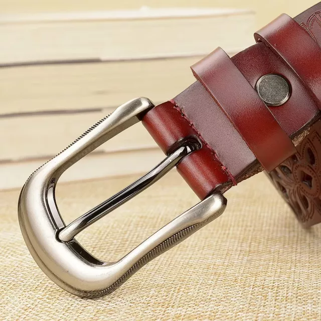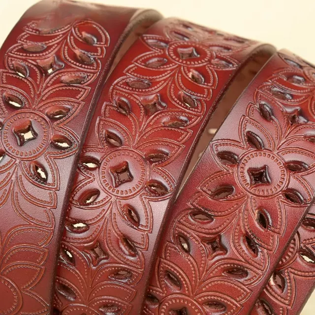 Turn heads and cinch your look with timeless style. This genuine leather women’s belt brings vintage flair and feminine detail to your outfit, all while providing the strength and durability of real cowhide. With its deep red hue and delicate hollow-out carved design, it’s the perfect accessory to dress up your jeans, skirts, or casual trousers. This is more than just a belt—it’s a bold finishing touch for your everyday look.